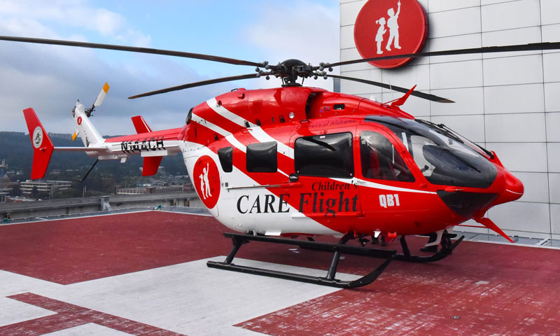 The Critical Care Transport team added a new, state-of-the-art helicopter in 2021. The Airbus H145 replaces the team’s previous helicopter, which had been in use since 2012. Among the technological features in the new helicopter are enhanced terrain avoidance systems, weather radar and more. These make it possible for the crews to travel in Instrument Flight Rules conditions – something they previously could not do, being restricted to Visual Flight Rules through the Federal Aviation Administration. Now, the team can transport patients even when the weather is not clear. The helicopter also has twin engines, a rolling stretcher and rear-loading capacity. It offers enough space for four crew members in the back by the patient, with a pilot and another passenger in the front. The helicopter is named QB1 after the Monday Morning Quarterback Club in recognition of the club’s fundraising efforts, which made it possible for Children’s of Alabama to get the helicopter. The operation of the helicopter is possible through a partnership between Children’s and Med-Trans Corporation, part of the Global Medical Response family of companies. Med-Trans provides all pilots, mechanics and other operation logistics for Children’s to use the new helicopter.